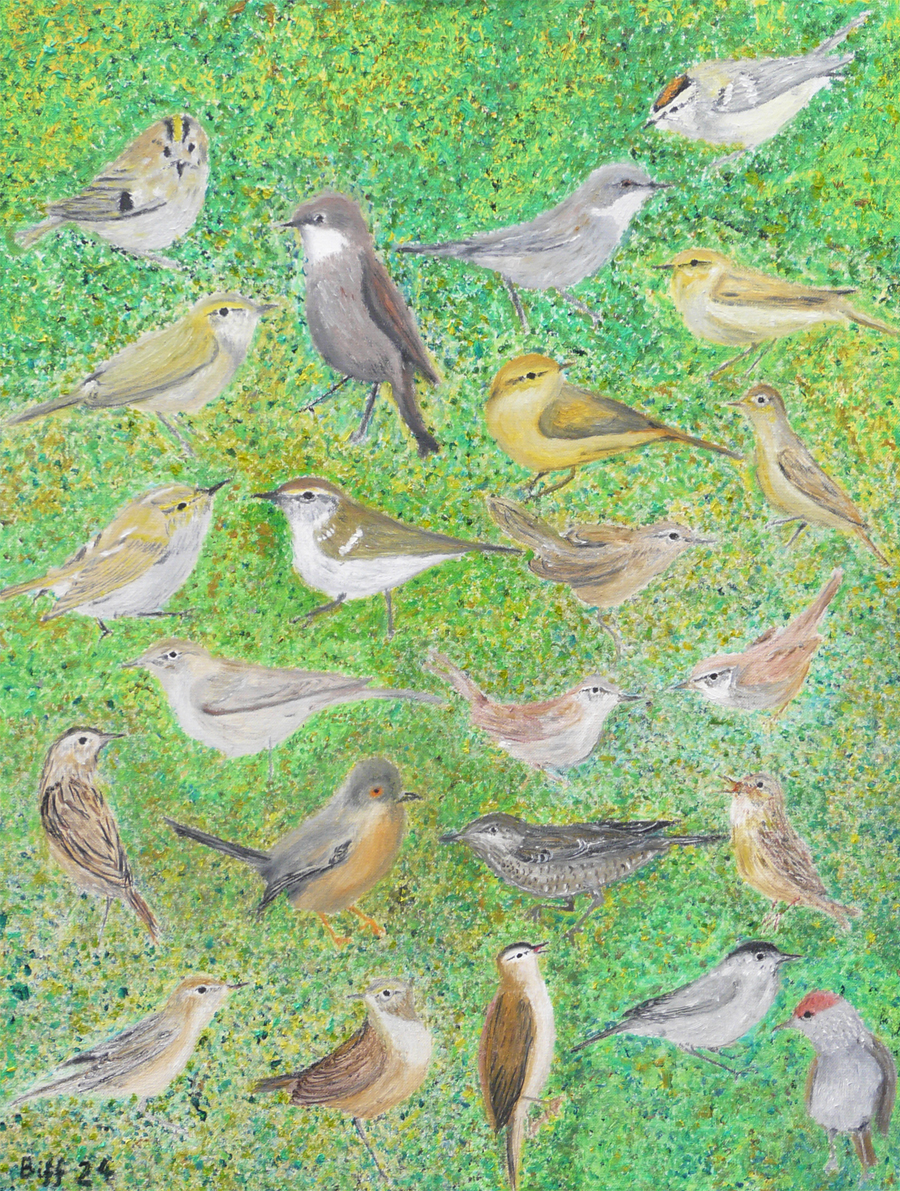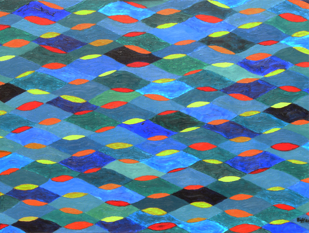 I made a template, a piece of card with waves cut into the top, and used it to draw a line of waves. Then moved the card down a bit and along a bit, so the crests of the lower line just intersected with the troughs of the line above. And so on. From identical, regular waves a more complex pattern emerges.